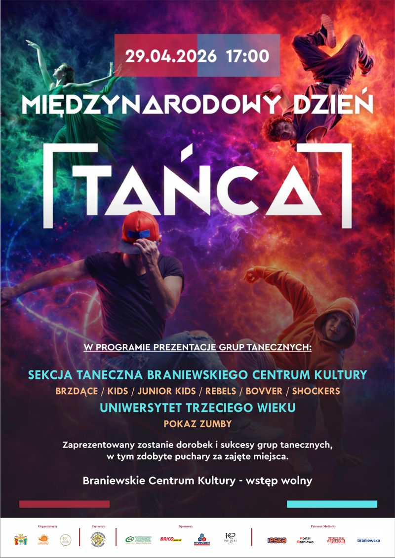 Obchody Międzynarodowego Dnia Tańca, które odbędą się 29 kwietnia 2026 roku o godzinie 17:00 w Braniewskim Centrum Kultury. Wstęp na wydarzenie jest wolny.